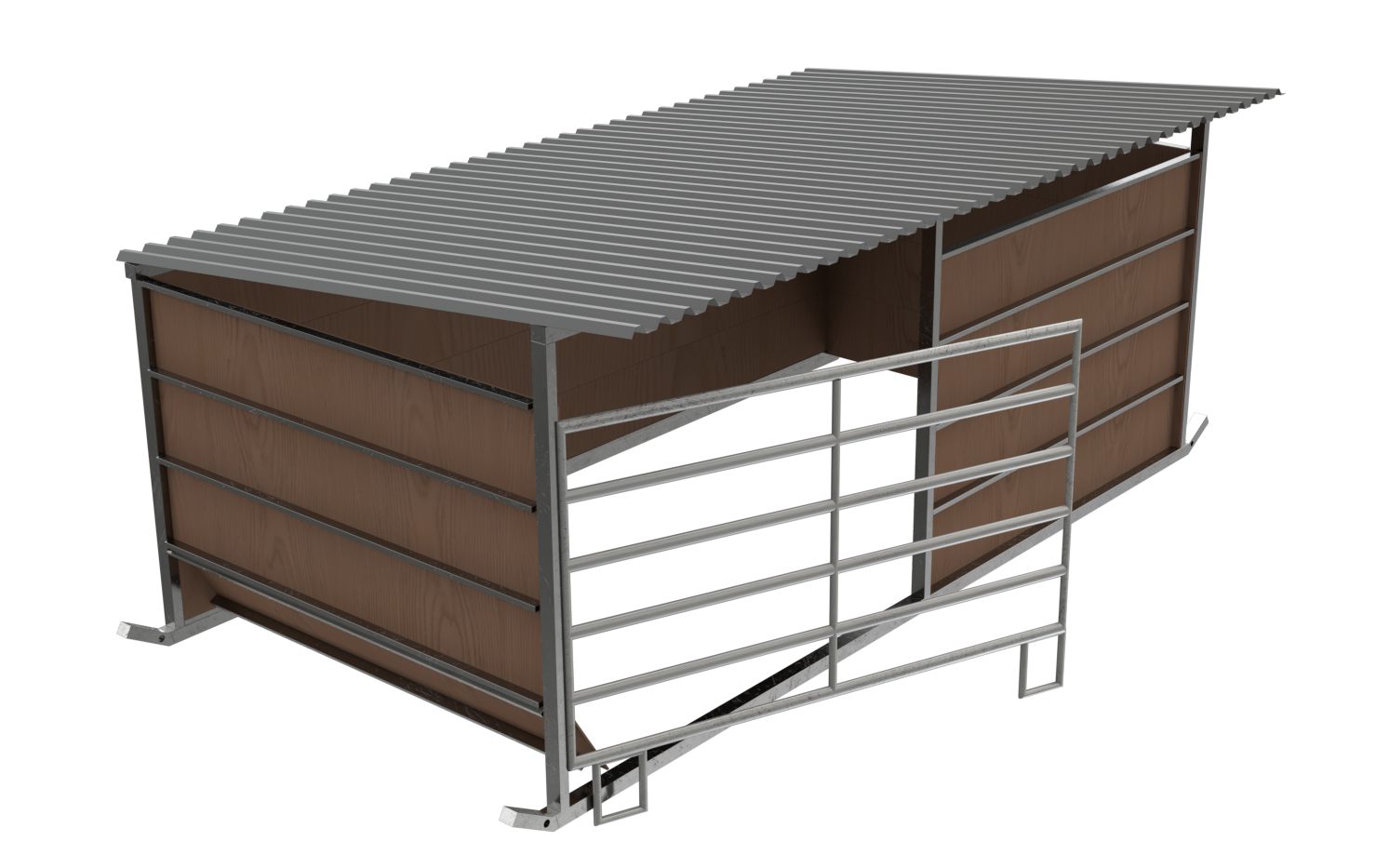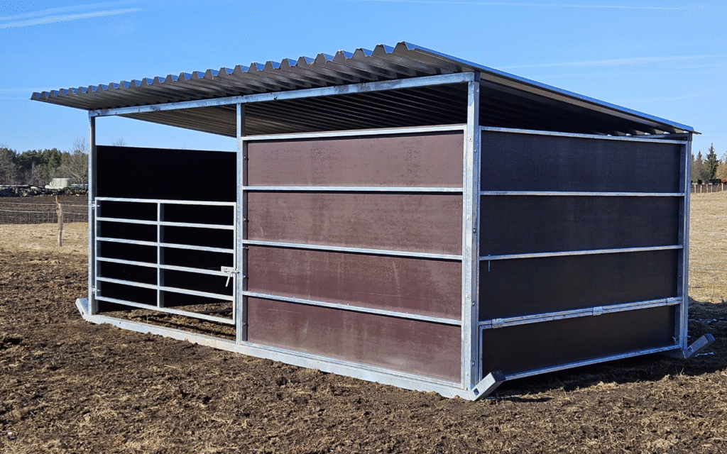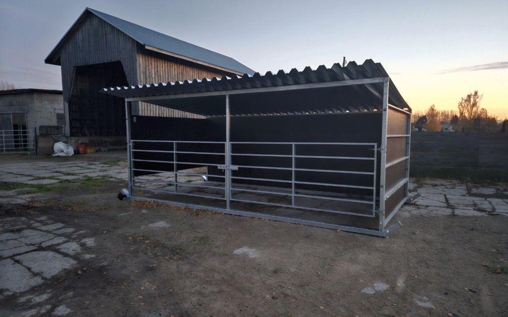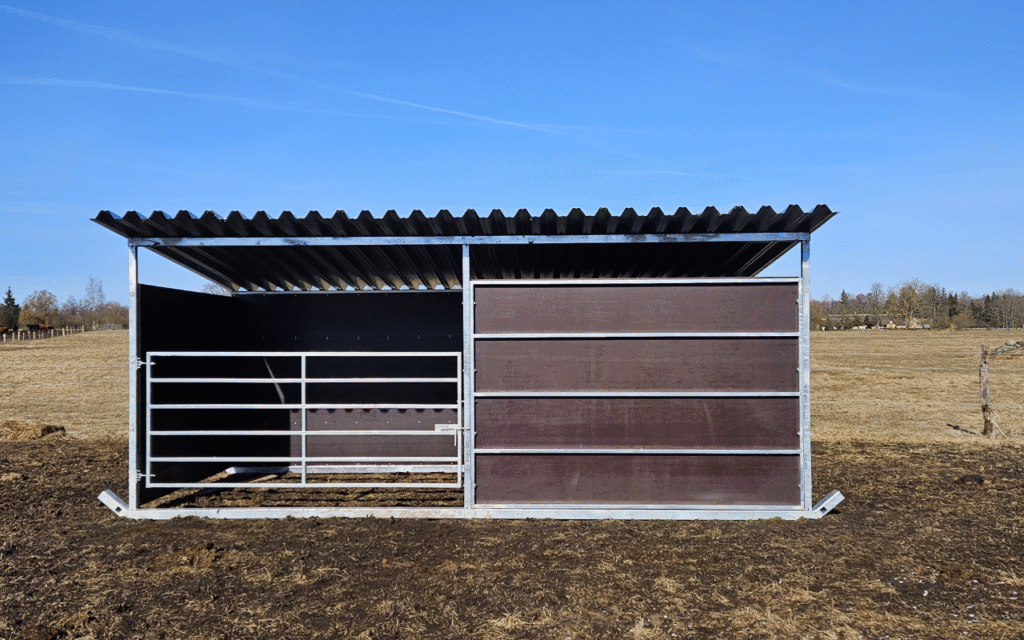 avatud osa katab osaliselt eemaldatav esisein laiusega 2,85m. Varjualusel riiviga värav 1,18×2,75. Seinad on ehitatud tsingitud